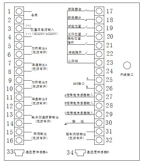 無線測溫在線檢測裝置由開關(guān)柜智能操控裝置、接點測溫傳感器、測溫采集接收模塊(已組裝在操控裝置里)及外置天線組成。