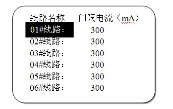 本菜單設(shè)置線路的門限電流。當線路的一次側(cè)電流小于門限電流時,該條線路不參與選線。按左右鍵翻頁,按上下方向鍵移動光標選擇需修改的參數(shù)項。按確認鍵進入修改狀態(tài),此時按方向鍵修改參數(shù)。修改后按“確認”鍵保存,按“取消”鍵不做保存。