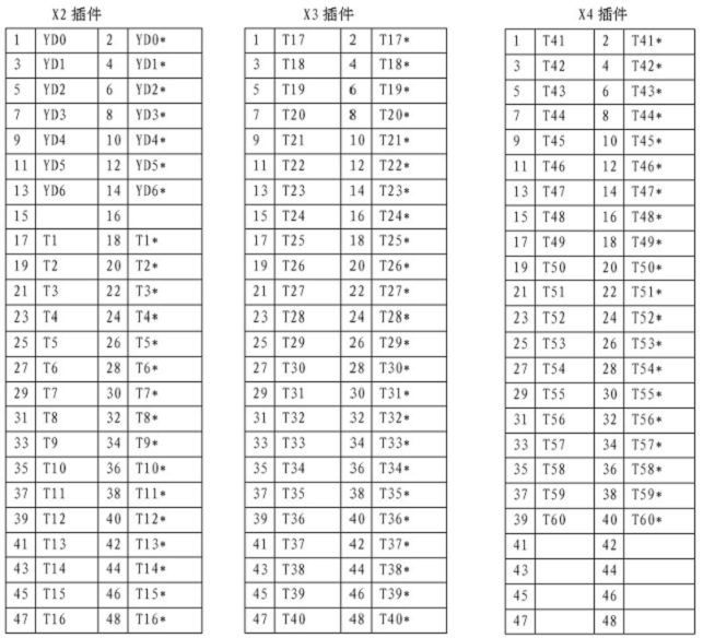 X2插件:端子1~14,遠動輸出接點;端子17~48,第1~16路出線的跳閘出口。