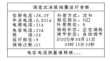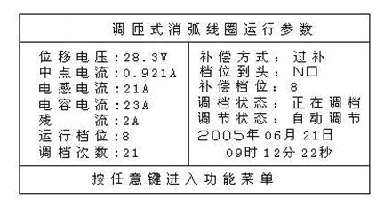 電網(wǎng)正常運(yùn)行時(shí)顯示屏顯示電網(wǎng)當(dāng)前中性點(diǎn)參數(shù)及時(shí)間,并預(yù)測(cè)電網(wǎng)在當(dāng)前狀況下發(fā)生單相金屬性接地時(shí)的電容電流、補(bǔ)償電流及殘流等;而電網(wǎng)在單相接地時(shí)顯示屏顯示實(shí)測(cè)的中性點(diǎn)電壓、電流、接地電容電流、工作檔位和接地起始時(shí)間等參數(shù)。如圖