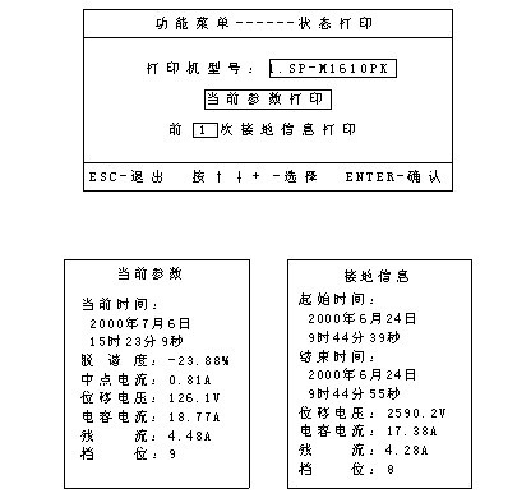 狀態(tài)打印—“狀態(tài)打印”下設(shè)有選擇打印機(jī)型號(hào)、當(dāng)前參數(shù)內(nèi)容及前幾次接地信息選擇,用方向鍵選擇,按“確定”鍵確認(rèn)并執(zhí)行,在打印接地信息時(shí)用“+”、“-”鍵改變所需打印的接地信息的次數(shù)。打印內(nèi)容如下圖。