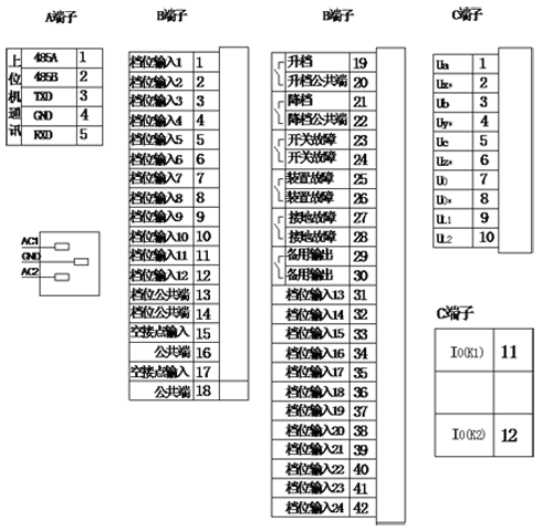 ⑦ 檔位1——檔位24為檔位遙信輸入,檔位公共端為遙信公共端。